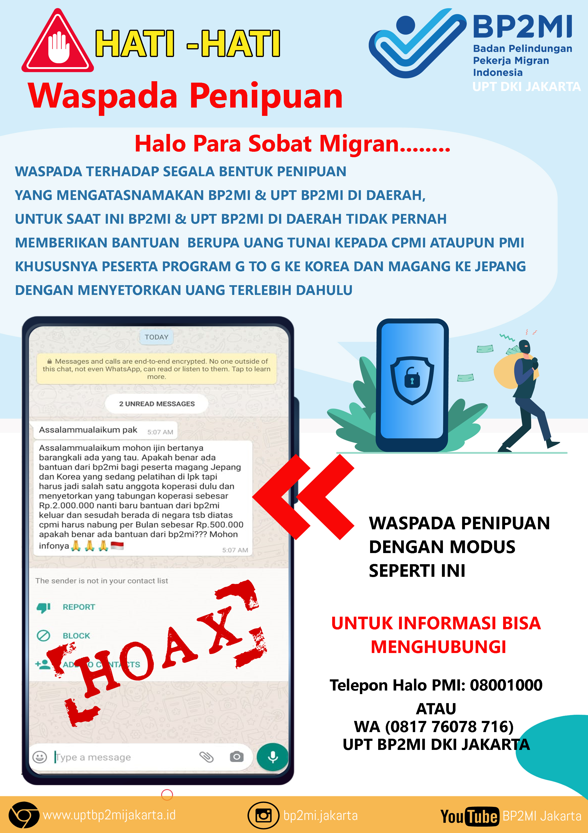 Waspada penipuan dengan berkedok program bantuan berupa uang tunai yang di berikan oleh BP2MI kepada CPMI atau PMI khususnya peserta program G to G ke Korea Selatan dan program Magang ke Jepang, ssat ini BP2MI tidak pernah mengadakan program bantuan tersebut.