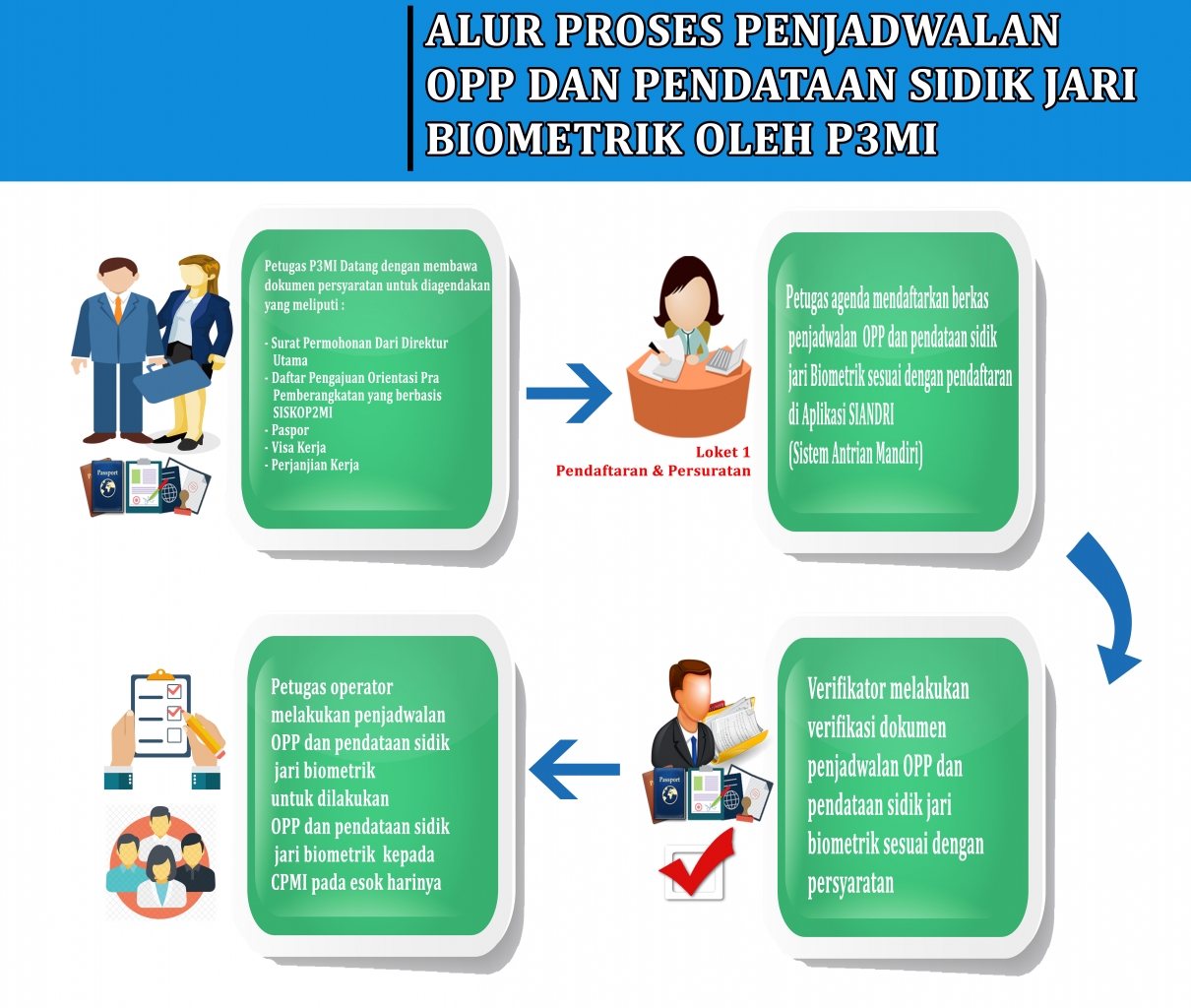Lama Waktu Pelayanan Penjadwalan opp per dokumen : 10 menit *Syarat dan ketentuan : semua dokumen PMI lengkap dan sesuai persyaratan serta SISKOTKLN serta sistem BPJS dan perbankan dalam kondisi normal/tidak off LINE